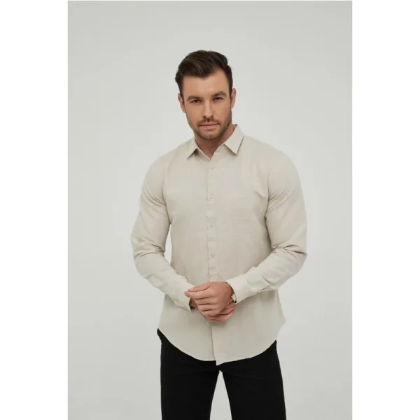 Overhemd heren lange mouw | Moda Italia | Yves Enzo Heren overhemd met lange mouw van het Italia Mode merk Yves Enzo. De heren blouse is gemaakt van linnen stoffen. Dit geeft een comfortabel draaggevoel. De linnen blouse met lange mouw past goed op je outfit in combinatie met een chino of een pantalon. Samenstelling: 100% Linnen Kleur: Beige Pasvorm: Normal Fit