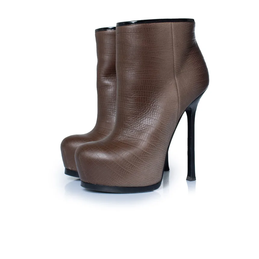 Aanbevolen verkoopprijs Yves Saint Laurent, Tribute leren enkellaarsjes met hagedissenprint. Het artikel verkeert in goede staat STAAT: goede staat MAAT: 35,5 BINNENZOOLAFMETINGEN: 23 cm HAKHOOGTE: 13,5 cm PLATFORM: 3,5 cm SCHACHTHOOGTE: 9 cm BREEDTE BOVENKANT: 12,5 cm MATERIAAL: leer KLEUR: bruin ARTIKELNUMMER: 9218