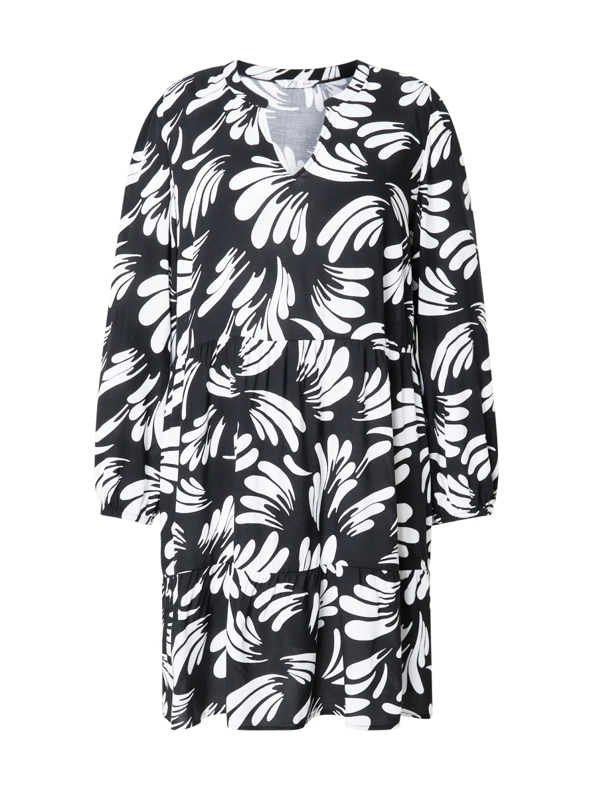 Design: Gevoerde zoom/rand, Flare, Elastische taille/zoom; Materiaal: Viscose; Halstype: Uitgesneden hals; Motief: Bloemenprint; Details: Volant, Gedrapeerd; Extra's: All-over patroon, Gladde stof; Lengte: Knielengte; Snit: Uitlopend; Pasvorm: Losse pasvorm; Armlengte: Lange mouw