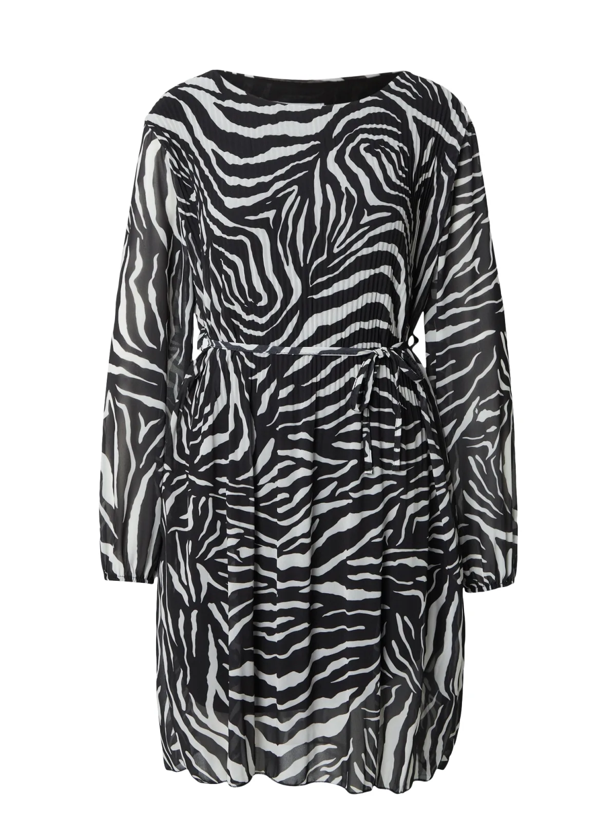 Design: Rechte zoom, Tailleriem; Halstype: Ronde hals; Motief: Dierenprint; Details: Gedrapeerd, Plissé; Extra's: All-over patroon, Riemlussen; Lengte: Knielengte; Snit: Getailleerd; Pasvorm: Normale pasvorm; Armlengte: Lange mouw