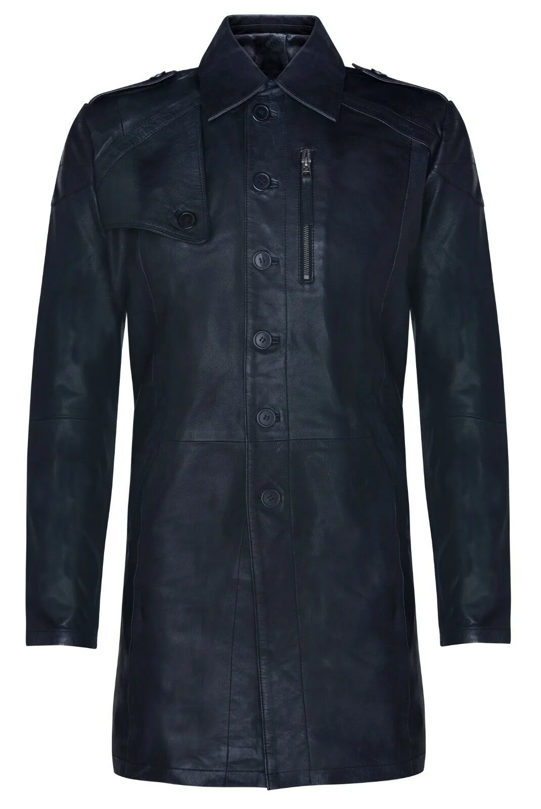 Zachte lange militaire trenchcoat van noodlijdend leer