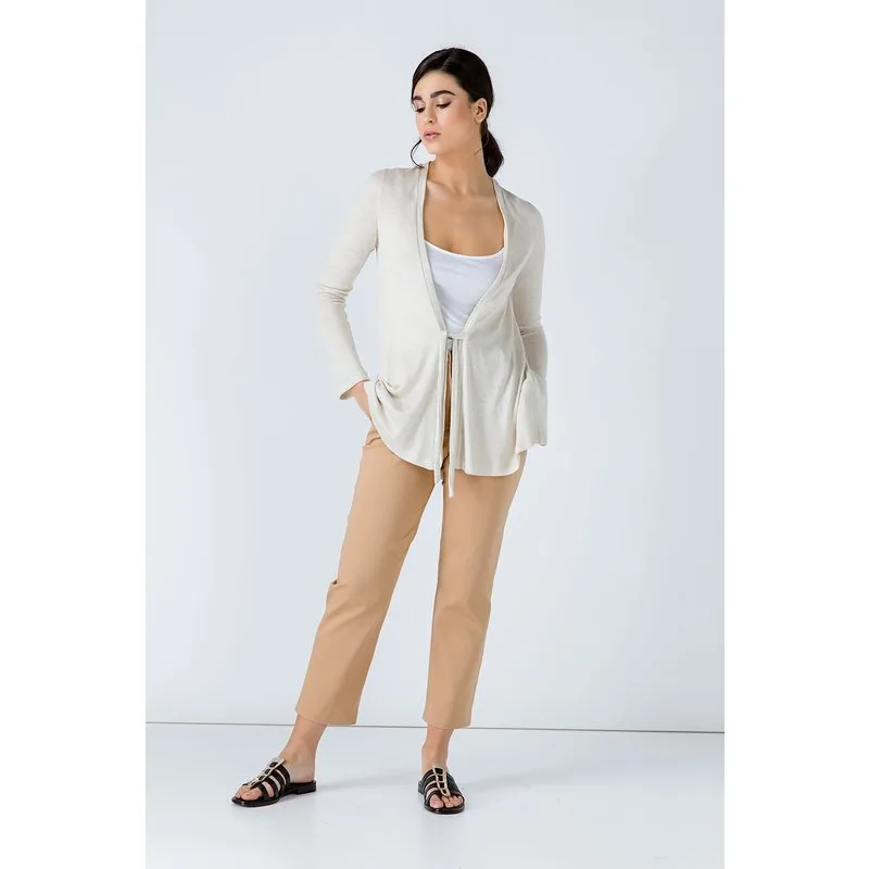 Gebreid vest met lange mouwen in zandstof met stretch, 70% viscose-30% linnen. Opengewerkt met een bandje aan de voorkant van het kledingstuk. Ons model is 172 cm en draagt maat 36/S. Afmetingen voor maat 36 (in cm): Schouder -37; Borst-45; Taille-47; Onderkant-67; Mouwlengte-64; Lichaamslengte-75.