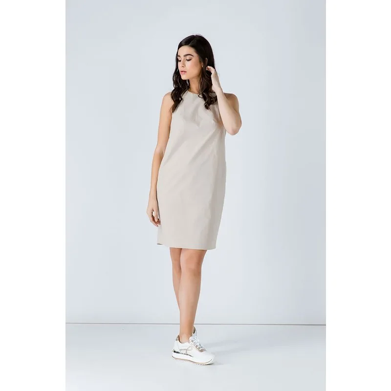 Zomerse zakjurk van zandkleurige geweven stof, 100% crushed cotton. Ronde hals en mouwloos. Darts op de borst en 2 zijzakken. Verborgen ritssluiting achteraan, toon op toon. Ons model is 172cm en draagt maat 36/S. Afmetingen voor maat 36 (in cm): Schouder -34; Borst-42; Taille-40; Onderkant-51;Lichaamslengte-86.100%COTTON
