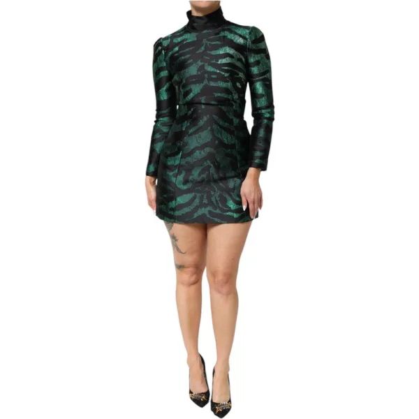 Trek de aandacht, straal zelfvertrouwen uit, maak een statement. Deze opvallende mini-jurk is ontworpen om de blikken te vangen op elke speciale gelegenheid. Gemaakt van luxe groen en zwart zebra-print brokaatstof, biedt het een verfijnde maar gedurfde uitstraling. De elegante lange mouwen en chique col creëren een verfijnd silhouet, wat zorgt voor een flatterende pasvorm. Ervaar ongeëvenaarde stijl en kwaliteit, perfect om een memorabele entree te maken op feesten of speciale evenementen.