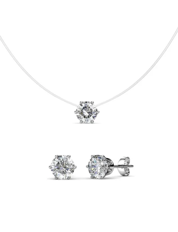 Samenstelling: hoogwaardig messing Afwerking: gerhodineerd Steensoort: Oostenrijks kristal Aantal stenen (stuks): 3 Steenkleur: kristal Kettinglengte: 200 + 50 Diameter van de oorbellen (mm): 5.2