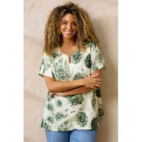Deze groene top met bloemenprint voor dames van Zhenzi is een luchtige keuze voor zonnige dagen. De frisse combinatie van groen en wit en de vrouwelijke bloemprint geven je outfit direct een lichte en verzorgde uitstraling. Dankzij het soepele materiaal en de rechte mouwen valt de top mooi langs het lichaam, zonder te knellen.Details die het verschil maken Gemaakt van 50% viscose, 30% katoen en 20% linnen voor een zachte en ademende touch Korte mouwen met rechte snit voor een relaxed en comfortabel gevoel Mao kraag voor een moderne, opstaande halslijn met een rustige uitstraling Groen met witte bloemenprint, passend bij het lente seizoen Geen zakken voor een gladde, clean look aan de voorkant Onderdeel van het grote maten assortiment, met aandacht voor ruimte en draagcomfortLicht en luchtig voor elke dagDeze top past goed bij een lichte jeans, een witte broek of een neutrale rok. Ideaal voor een werkdag met een vest erover of gewoon zo op een milde lentedag. De stof voelt soepel aan op de huid en beweegt makkelijk met je mee.Zhenzi, stijl in grote matenZhenzi richt zich op damesmode in grote maten met een focus op een prettige pasvorm en eigentijdse vormen. De ontwerpen volgen de seizoenen en trends, zodat je steeds weer kunt kiezen uit kleding die goed zit en er verzorgd uitziet.Een lichte, bloemige basic die je makkelijk het hele seizoen door draagt.