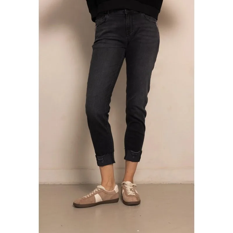 Deze stoere jeans van Zhrill heeft een mooie vintage denim wassing en destroyed details aan de zoom . De zoom is omgeslagen en aan de onderkant vastgestikt. Zhrill staat bekend om zijn mooie en comfortabele pasvorm dus deze jeans zal nog jaren in jouw kast liggen! Mooie zwarte washing. 90% katoen 8% polyester 2% elastene. Broek heeft 1 lengte
