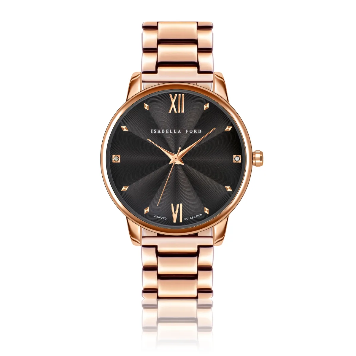 Isabella Ford heeft oude en nieuwe concepten prachtig gecombineerd met het luxueuze Coco diamanten horloge. Het komt in een opvallende rijke chocoladebruin, met gouden wijzers en uur markers rose, prachtig in evenwicht gebracht door twee echte hand set diamanten. Isabella Ford wijdt deze vrouwelijke charme horloge aan onverschrokken fashionistas die durven anders te zijn.Modelnaam: Coco Rose Gold LinkKastmaat mm: 38Kastmateriaal: MetaalsamenstellingKleur kast: ZilverKleur kast: Ion-plating (IP)Armbandmaat mm: 18×18Armbandmateriaal: Roestvrij staalArmbandkleur: Goud rose Wijzerplaatkleur: ChocoladebruinGlas: Gehard Mineraal KristalDiamond Details: Cut: Single; Clarity: I-3; Kleur: Upper crystal;Case back: Roestvrij staalWaterbestendigheid: 3 ATM
