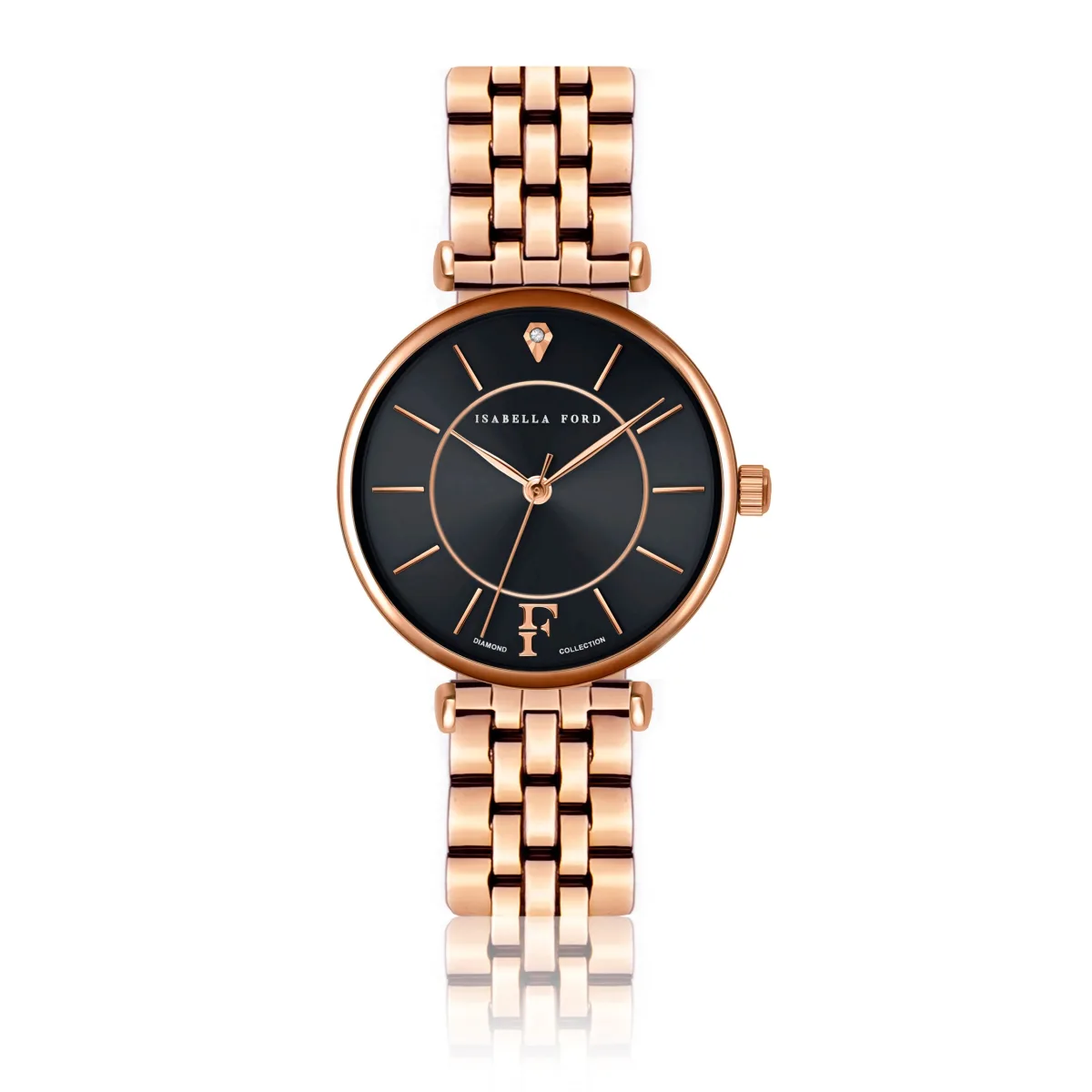 Met een elegante zwarte sunray-wijzerplaat die perfect wordt aangevuld met levendige gouden details rose, is dit luxe horlogeIsabella Ford 's eerbetoon aan dynamische tweekleurige accessoires en verfijnde functionaliteit. Opgedragen aan chique vrouwen die van design houden, schittert een prachtige met de hand aangebrachte echte diamant om middernacht.Modelnaam: Portia Rose Gold LinkKastmaat mm: 32Kastmateriaal: MetaalsamenstellingKleur kast: Goud rose Case Plating: Ion-plating (IP)Armbandmaat mm: 14×14Materiaal band: Roestvrij staalKleur band: Goud rose Kleur wijzerplaat: Zwart SunrayGlas: Gehard mineraal kristalDiamant details: Cut: Single; Clarity: I-3; Kleur: Upper crystal;Case back: Roestvrij staalWaterbestendigheid: 3 ATM