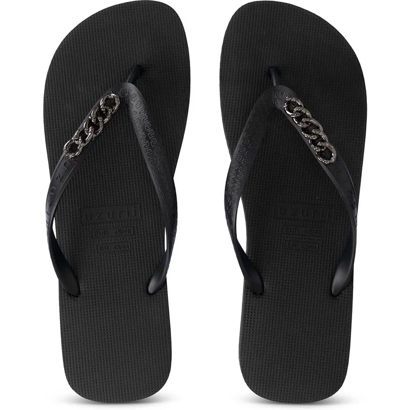 De slippers uit de Sport Collectie kenmerken zich door hun stoere ontwerp. De band is gedeeltelijk bedekt met een forse zilveren ketting. Deze handgemaakte slippers zijn een stijlvol statement piece dat op straat bijzonder in het oog zal vallen. Het experimenteren met edelstenen in talloze vormen, kleuren en texturen is wat onze ontwerpen kenmerkt. De V wordt gedetailleerd met het kenmerkende Uzurii logo over de bandjes. Slippers met open teen en een platte rubberzool. Rubber - PVC – Stenen Zoolhoogte: 1,5cm De V (band): Gemaakt in China Zool: Gemaakt in Brazilië