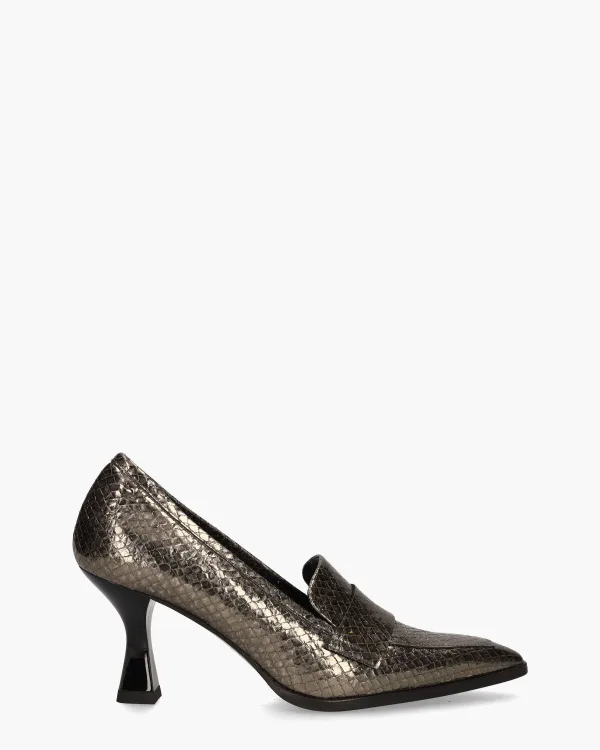 Pumps voor dames 2505 uit de collectie van Zinda. Dit carrémodel heeft een upper van metallic zilvergrijs leer met een crocoprint De binnenkant is ook in leer uitgevoerd. De pennyband over de wreef geeft de pumps een classic look. Het queeniehakje in zwart glimmend kunststof materiaal is circa 8 cm hoog. Kleur: