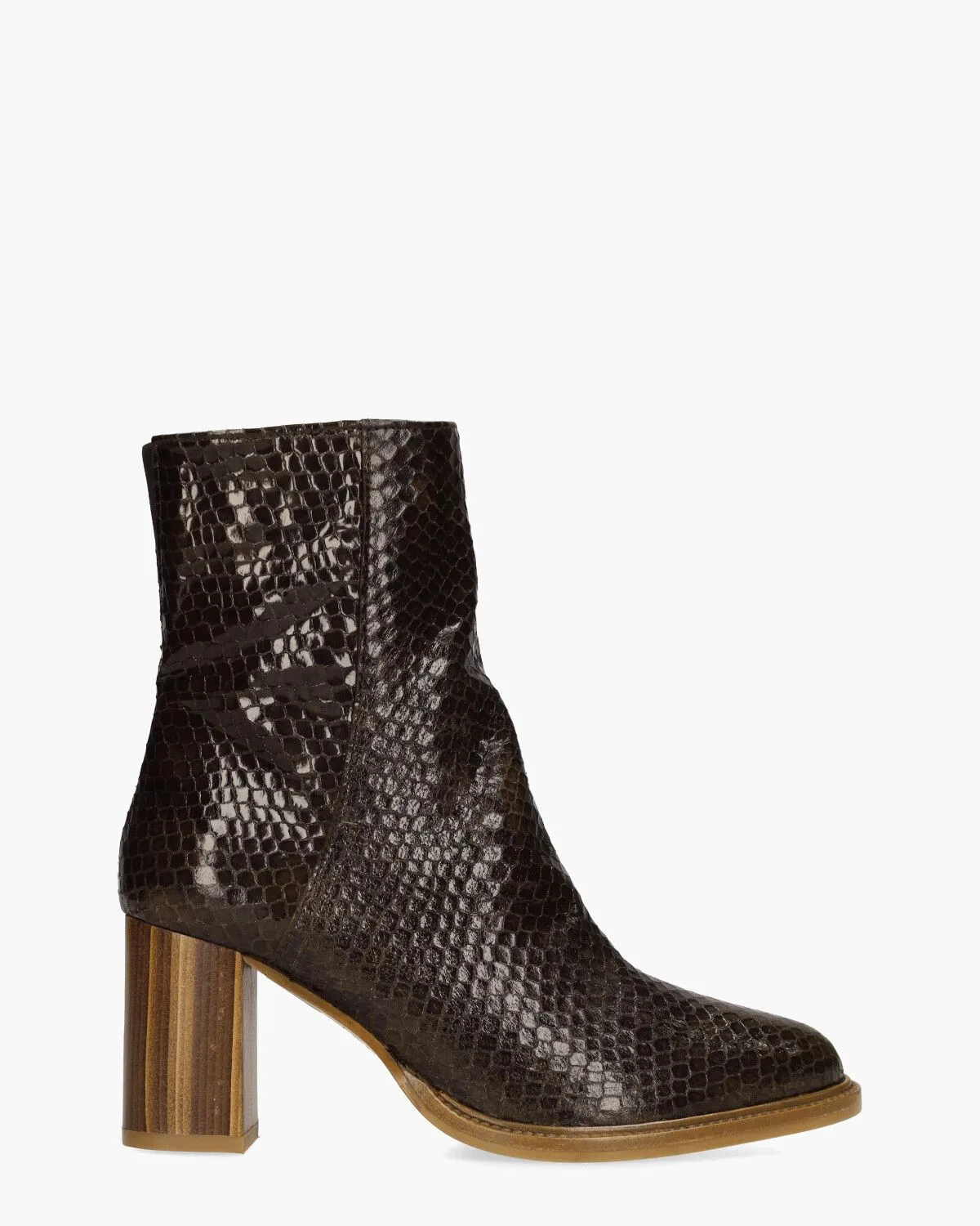 Met deze donkerbruine leren dames enkellaarsjes 3321 van het merk Zinda voeg je moeiteloos karakter toe aan je look. De verfijnde slangenprint en glanzende finish zorgen voor een opvallende textuur, terwijl de brede, gestreepte 7 cm hoge hak in houtlook een onverwacht designaccent biedt. Het model sluit mooi om de enkel en is voorzien van
