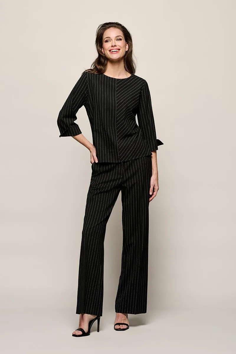 De Zion top in zwart-wit is een elegante blouse die een moderne twist geeft aan een klassieke stijl. Het model heeft een ronde hals en drie kwart mouwen, waardoor het een tijdloze basis is die zich gemakkelijk laat combineren met uiteenlopende outfits. De subtiele krijtstreep is speels geplaatst, met een diagonale lijn aan één kant die een dynamisch en visueel interessant effect creëert. De licht aangesloten pasvorm sluit mooi aan bij het lichaam, terwijl de lengte tot op de heup zorgt voor een verzorgde uitstraling die zowel casual als iets netter gedragen kan worden. De top is vervaardigd van een comfortabele stretchstof van 63 procent polyester, 34 procent viscose en 3 procent elastaan, waardoor hij soepel valt en prettig draagt, terwijl de vorm goed behouden blijft. De Zion top valt normaal qua maat, zodat de gebruikelijke maat aangehouden kan worden. Dankzij het speelse krijtstreepje en de lichte stretchkwaliteit is deze zwart-witte blouse een veelzijdig item dat moeiteloos gecombineerd kan worden voor zowel werk als vrije tijd.