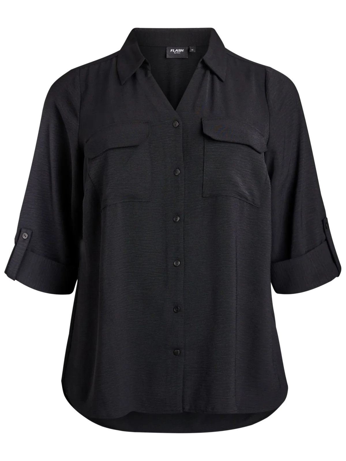 Blouse type: Klassieke blouse; Design: Knop placket, Roll-up mouwen; Type sluiting: Knoopsluiting; Materiaal: Gerecycled materiaal; Motief: Effen; Kraag: Kentkraag; Extra's: Op staal naden, Gladde stof; Pasvorm: Losse pasvorm; Armlengte: Driekwart mouw; Lengte: Normale lengte