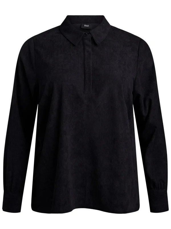 Blouse type: Blouseshirt; Design: Gevoerde zoom/rand; Materiaal: Corduroy; Motief: Effen; Kraag: Kentkraag; Details: Plissé; Extra's: Op staal naden; Pasvorm: Normale pasvorm; Armlengte: Lange mouw; Lengte: Normale lengte
