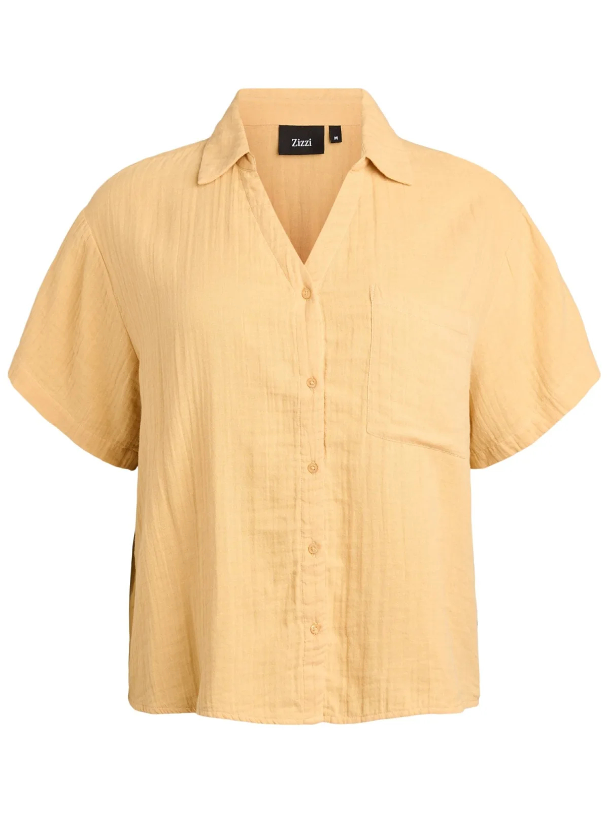 Blouse type: Klassieke blouse; Design: Knop placket, Overcut schouder, Turn-down kraag, Borstzak; Type sluiting: Knoopsluiting; Materiaal: Mousseline; Motief: Effen; Extra's: Op staal naden, Met textuur; Pasvorm: Losse pasvorm; Armlengte: Halve mouw; Lengte: Normale lengte