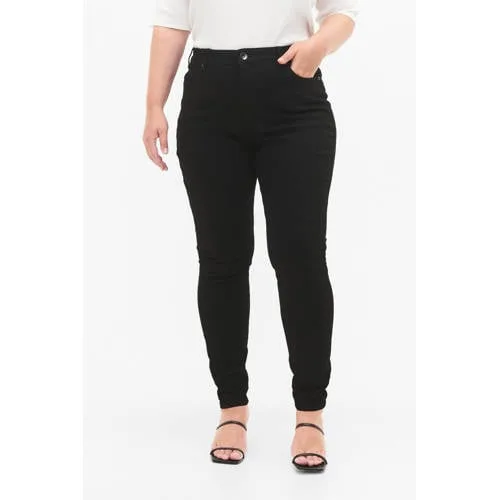 Zizzi zwarte skinny jeans voor dames is gemaakt van stretchdenim. Deze broek heeft een hoge taille en een 5-pocket ontwerp. Voorzien van een rits- en knoopsluiting, biedt het comfort en stijl in één.