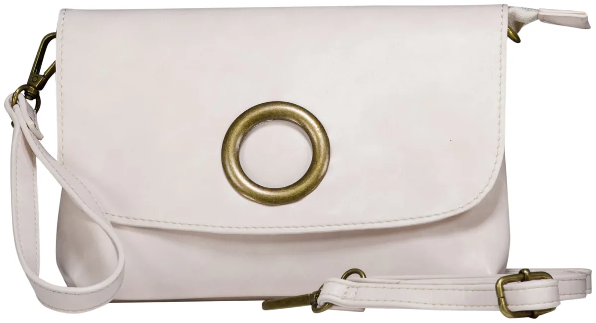 Tas van Zo, tas met casual stijl, effen uitvoering en rits. De compacte vorm heeft een flap met opvallende metalen ring, een extra ritsvak aan de achterzijde en goudkleurige details. Met afneembare schouderband en polsband voor flexibel dragen bij casual momenten.