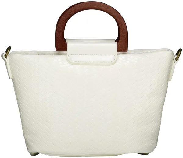 Tas van Zo, is een casual accessoire met gevlochten structuur, stevige houten handgreep en aanschuifsluiting. De compacte vorm heeft een ritsvak aan de buitenzijde en metalen details, handig voor essentials. Past moeiteloos bij een bloemenpatroon outfit voor een ontspannen, dagelijkse gelegenheid.