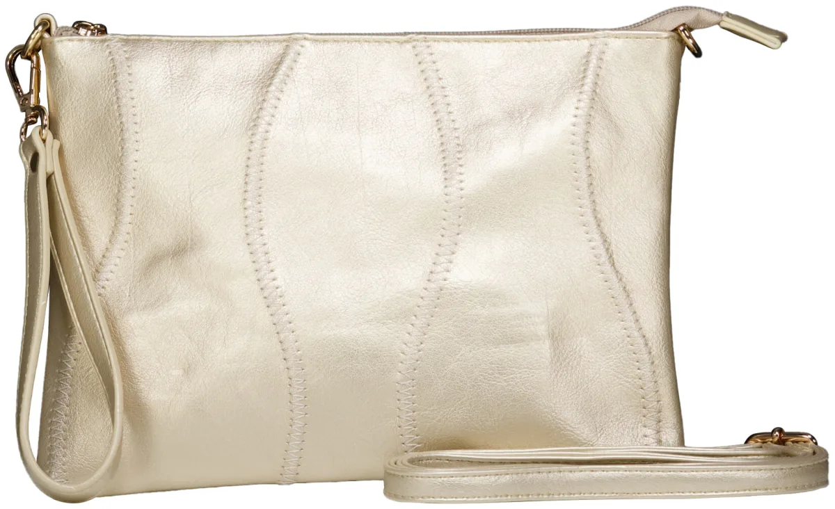 Tas van Zo met een effen, minimalistisch ontwerp en een ritssluiting. De gladde afwerking, golvende sierstiksels en het metalen logo geven een rustige, verzorgde uitstraling. Voorzien van polsband en afneembare schouderriem, plus een ritsvak aan de buitenzijde. Draagt makkelijk casual of netjes.