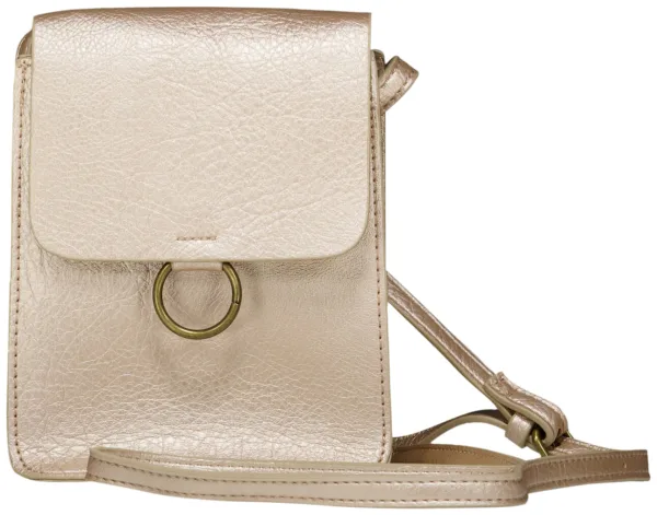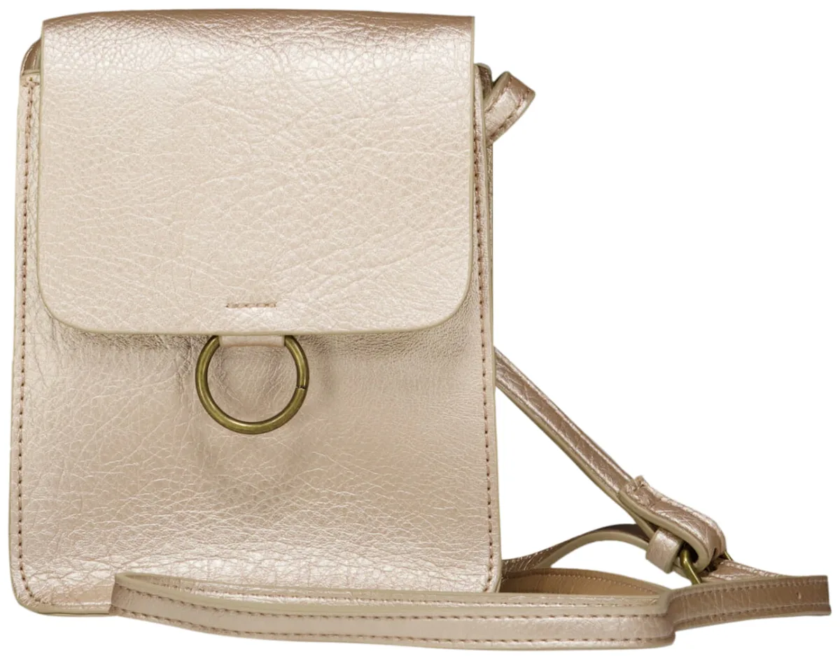 Tas van Zo, dames tas met casual, feminine uitstraling en effen design. Compact crossbody model met verstelbare schouderband, klep met ringdetail, en subtiele sierstiksels. De licht glanzende, leerlook finish en het smalle formaat maken het handig voor telefoon, pasjes en sleutels.