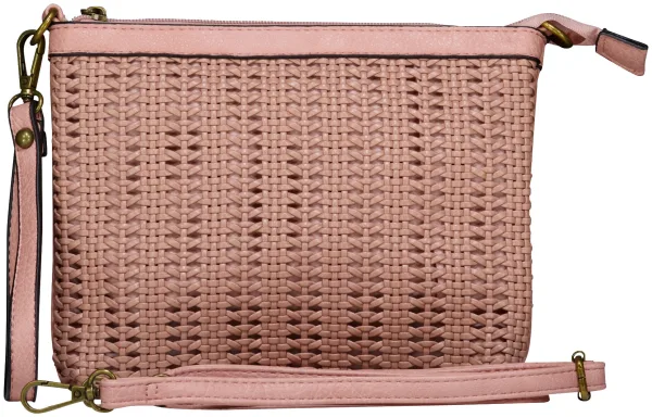 Tas Zo is een casual, bohemian model met rits, effen voorzijde en een gaatjespatroon met gevlochten structuur aan de achterkant. Met afneembare polsband en verstelbare schouderriem. Het voorvak met rits houdt essentials overzichtelijk. Combineer met een luchtige jurk of denim.