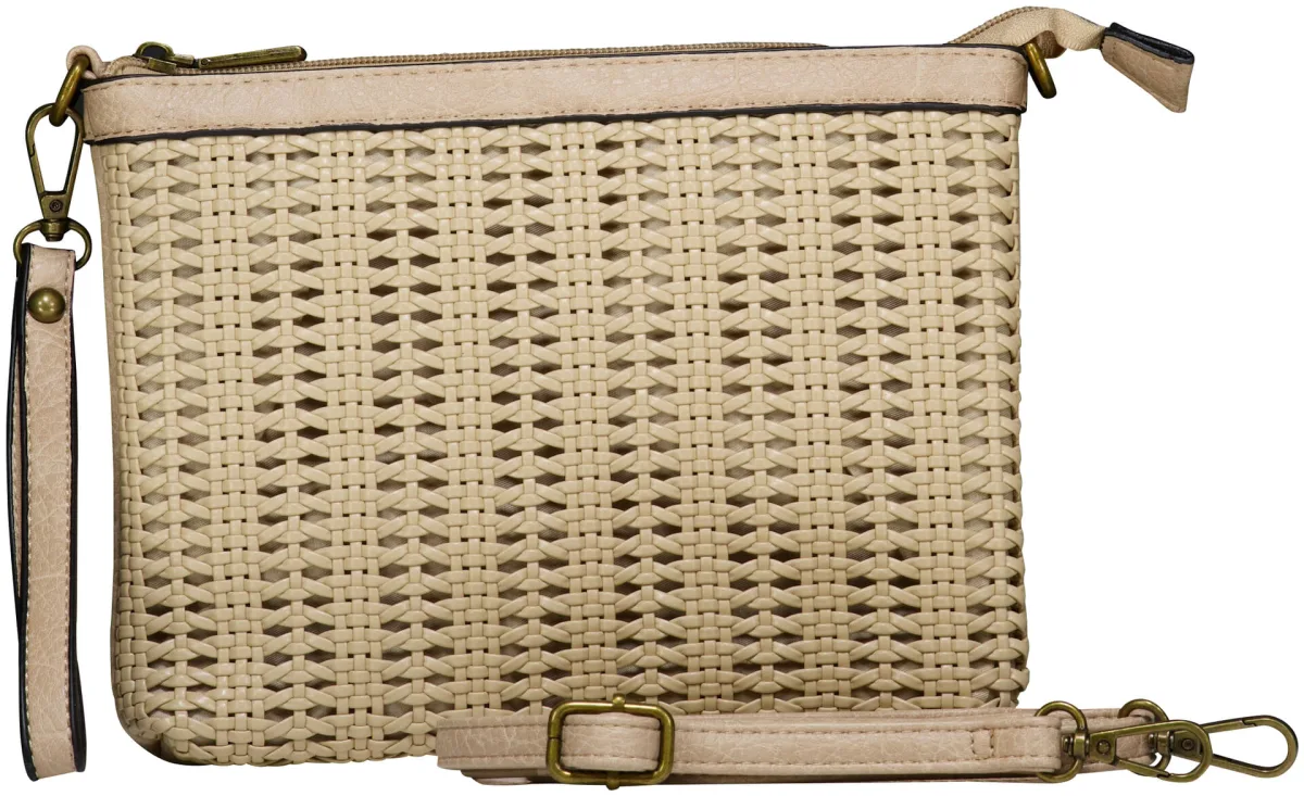 Tas Zo is een casual, bohemian model met rits, effen voorzijde en een gaatjespatroon met gevlochten structuur aan de achterkant. Met afneembare polsband en verstelbare schouderriem. Het voorvak met rits houdt essentials overzichtelijk. Combineer met een luchtige jurk of denim.