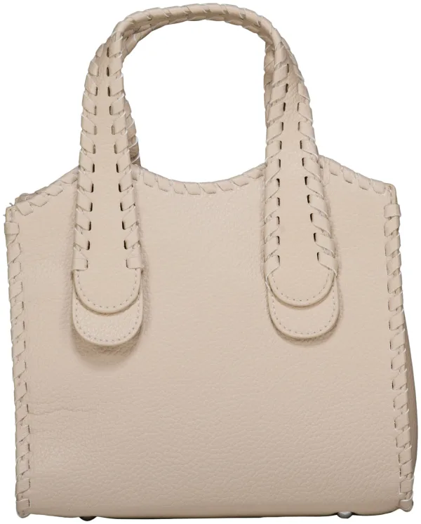 Tas Zo met casual, sophisticated uitstraling en effen afwerking. Het compacte model heeft twee stevige handgrepen, een gestructureerd, korrelig oppervlak, brede zijpanelen en opvallende gevlochten sierstiksels langs randen en hengsels, waardoor de dames tas netjes in vorm blijft.