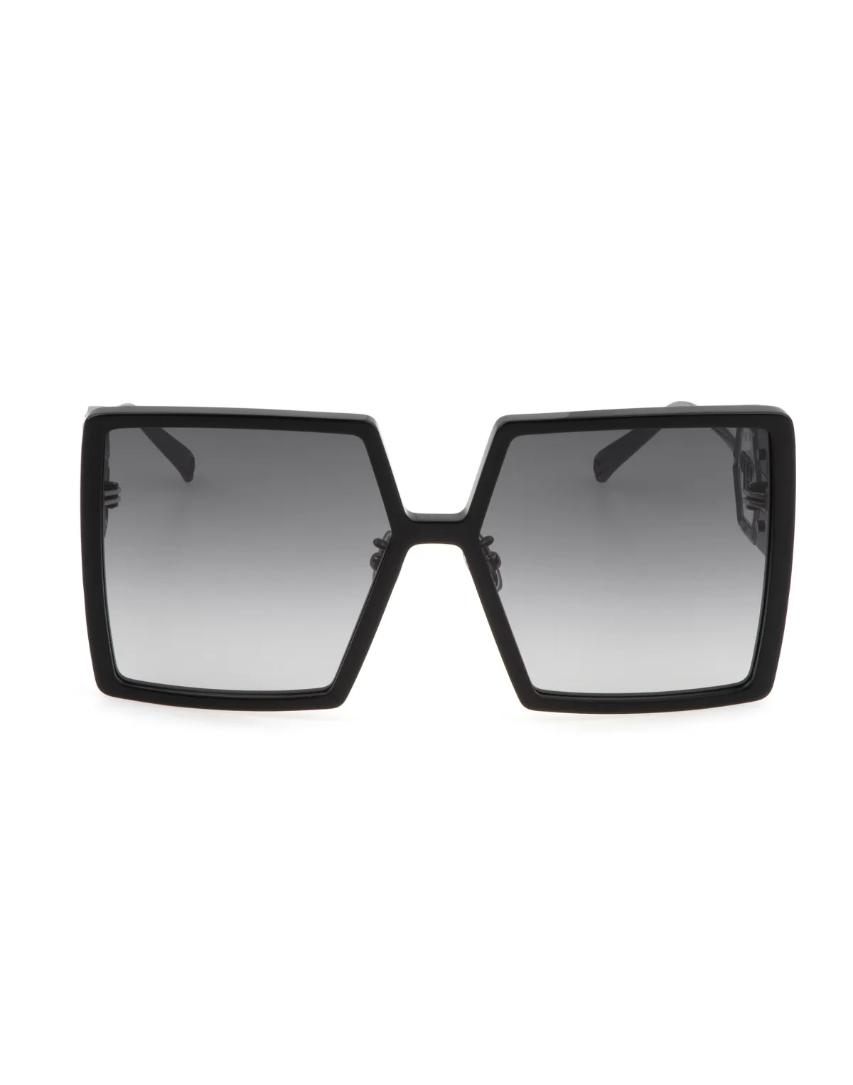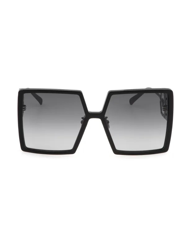 Zonnebril van zwart acetaat. Oversized geometrische sahpe, titanium pootjes met PP hexagonaal logo Materiaal voorkant: Titanium Materiaal veren: Acetaat Kleur montuur: SHINY BLACK Kleur lenzen: SMOKE GRADIENT SMOKE Afmeting: 61