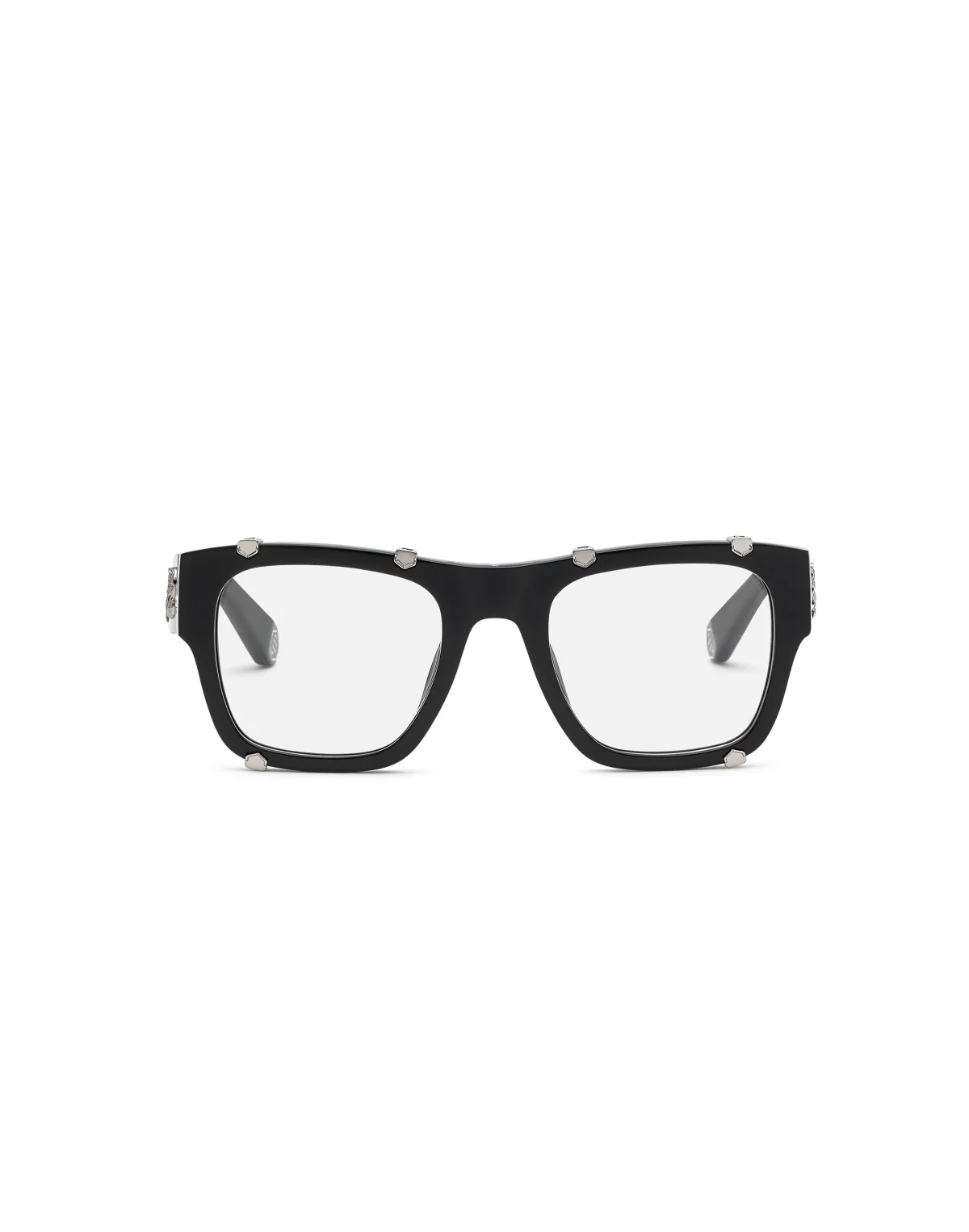 VIERKANTE ACETAAT VOORKANT MET METALEN NIETJES. ACETAAT VEREN MET DRIEDIMENSIONAAL GOTISCH LOGO. DETAILS: GROOTTE: 54-23-145 KLEUR FRAME: SHINY DARK HAVANA KLEURLENSEN: BRUIN