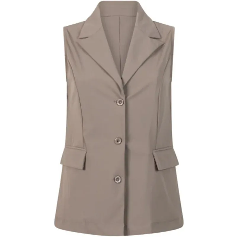 De Travel Gilet Angelique Taupe 251 van Zoso is een elegante en veelzijdige mouwloze blazer die perfect is voor een gelaagde look. Het gilet is uitgevoerd in een zachte taupekleur en heeft een klassieke reverskraag met een knoopsluiting aan de voorkant.Extra details zijn: Klassieke kraag Knoopsluiting klepzakken Licht getailleerdMateriaal:80% Polyamide, 20% ElastanWasvoorschrift:Machinewas max. Fijnwas 30 graden Celsius. Niet in droger