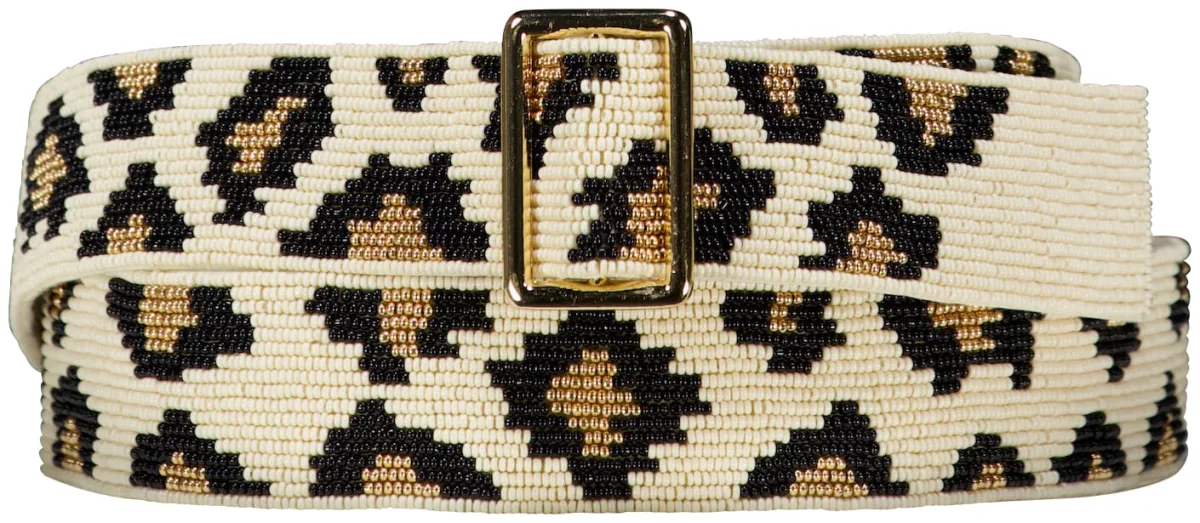 Riem van kraal design panter van Zusss. Deze elegante dames riem heeft een opvallend panterprint patroon, gemaakt van hoogwaardige kralen. De verfijnde gesp zorgt voor een perfecte pasvorm, terwijl de modieuze uitstraling een vleugje stijl toevoegt aan elke outfit.