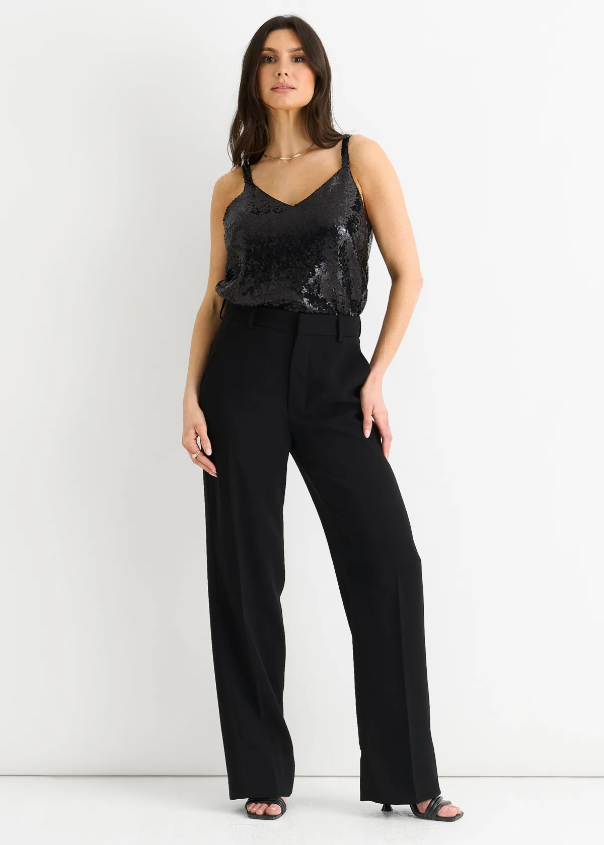 Voeg wat glitter toe aan je avondkleding met deze zwarte Cami-top met paillettenprint en V-hals. De v-halslijn zorgt voor een flatterend silhouet, terwijl de paillettenversieringen een vleugje glamour toevoegen. Deze top is perfect voor elke gelegenheid en laat je stralen.