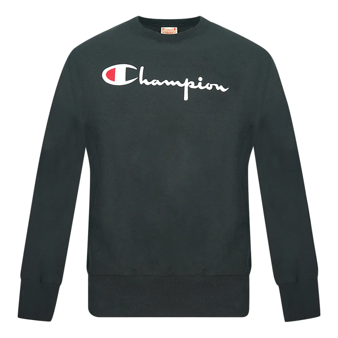 Zwart sweatshirt met Champion Script-logo. Champion zwarte trui met ronde hals. Merklogo op de borst. 73% katoen 27% polyester. Elastische mouw- en taille-uiteinden. Productcode - 215211 KK001