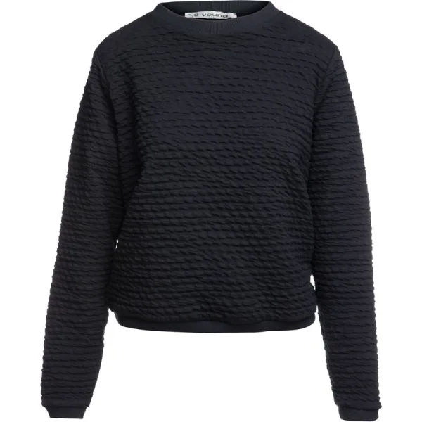 Dit zwarte sweatshirt is gemaakt van gebreide jersey met stretch. Hij heeft een ronde halslijn met een ribboord van 2 cm. Met lange mouwen en geribde boorden. Dit sweatshirt creëert bij het dragen een subtiel blousoneffect. Een relaxed model.