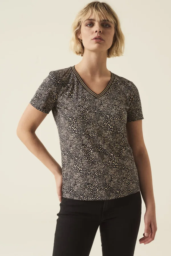 T-shirt met allover print. Het T-shirt heeft korte mouwen, een regular fit en een v-hals. Dit item is gemaakt van 50% katoen en 50% modal.