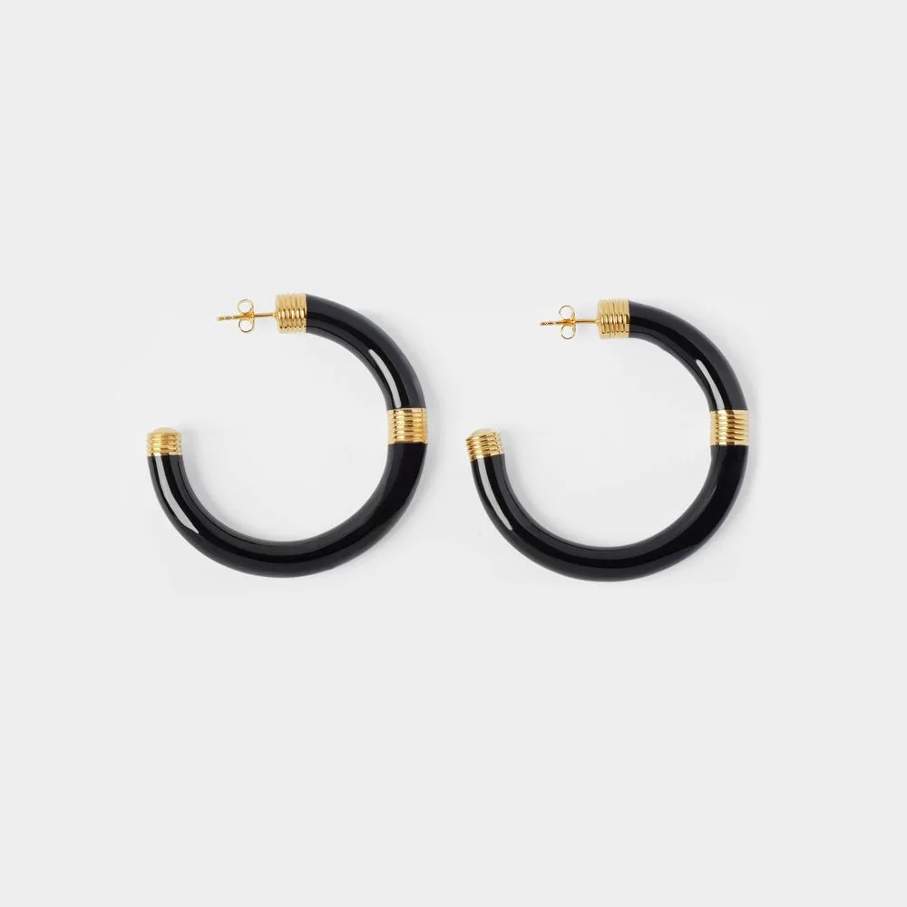 Deze oorbellen uit de Katt-serie van Aurélie Bidermann zijn een echte blikvanger. Gedragen met een losse chignon en gecombineerd met een geborduurd katoenen jurkje zijn ze de perfecte partner voor een bohemian-chique look die je de hele zomer kunt dragen. Materiaal: 18-karaats verguld bakeliet. Kleuren: Zwart. 18-karaats verguld bakeliet. Sluiting: geschikt voor oren met gaatjes. Width: 1. Height: 1. Length: 4.