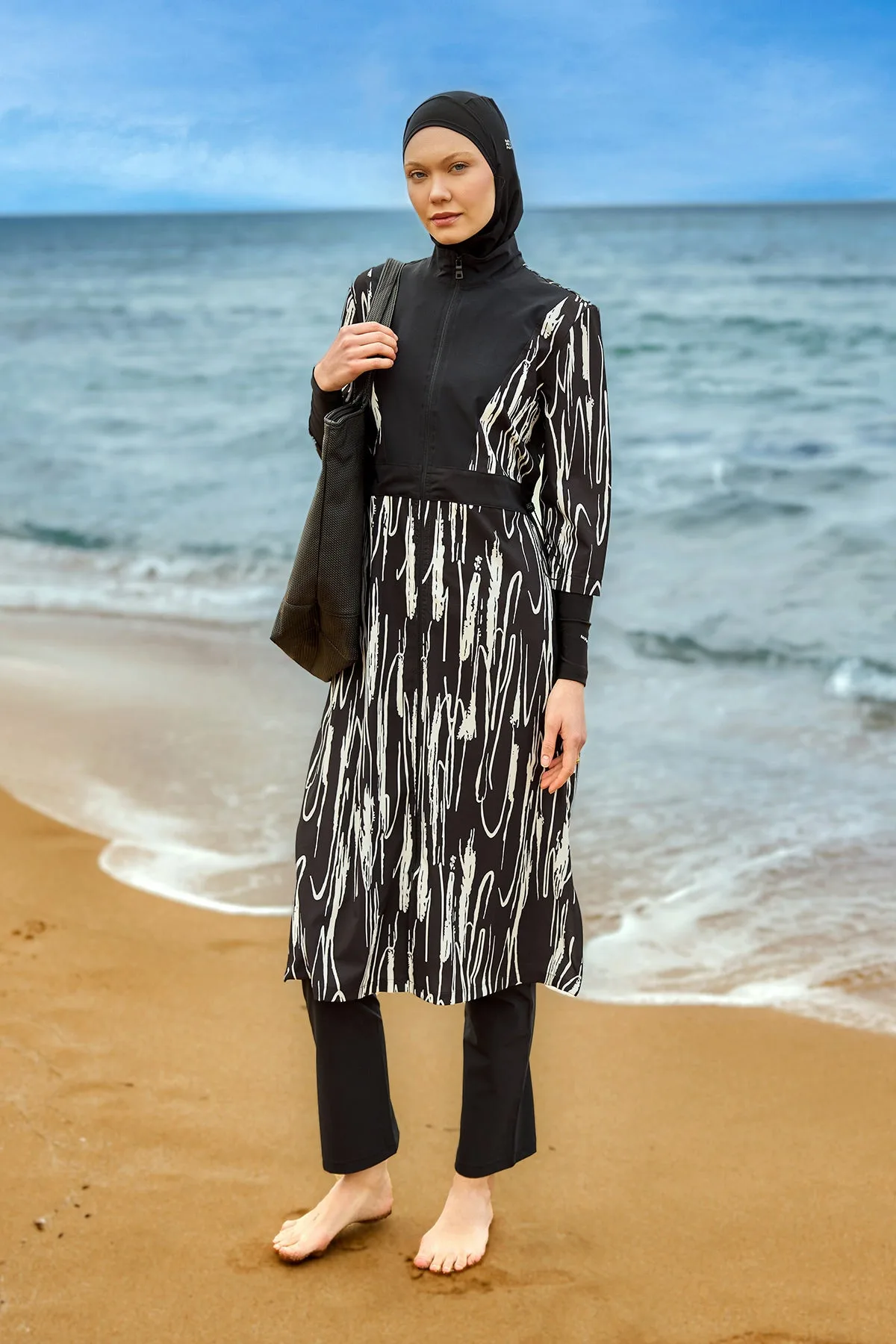 Marina Black Full Coverage Swimwear Burkini Set M2504 Ontdek ultieme functionaliteit en elegantie in de Marina M2504 burkini. Deze 4-delige set met volledige dekking heeft een verlengde tunieklengte met zijsplitten voor optimale bewegingsvrijheid en biedt comfort, bescheidenheid en praktische prestaties dankzij de waterafstotende stof en het doordachte ontwerp. Noot van de redactie: De M2504 is ontworpen met het oog op functionaliteit en onderscheidt zich door de zijsplit aan de zoom – strategisch toegevoegd om de beenbeweging in het water te bevorderen, ondanks de lange lengte van 113 cm van de tuniek. Uitgevoerd in klassiek zwart, combineert deze set elegantie met functionele details voor zorgeloos zwemmen. Productdetails HOGE HALS Biedt elegante volledige halsbedekking met een minimalistisch en strak silhouet. WATERAFVOEREND PANEEL Mesh panelen onder de armen en langs de zijkanten laten water snel weglopen en voorkomen een opgeblazen gevoel. WATERAFSTOTENDE STOF Droogt snel dankzij de hydrofobe afwerking en plakt niet aan het lichaam. ZIJSPIT Geïntegreerde split aan de zoom biedt extra bewegingsvrijheid voor de benen in het water. MAATOPTIES VOOR DE ZWEMBADBEKER De maat van de zwemmuts varieert afhankelijk van de lichaamsgrootte: S–2XL krijgt één maat, 3XL–5XL krijgt een grotere maat. ANTISLIPSTRIP De binnenband voorkomt dat de zwemmuts afglijdt tijdens het bewegen of zwemmen. SLUITING MET KNOP VOOR DE TUNIEK Een verborgen knoop bevestigt de tuniek aan de broek, zodat alles op zijn plaats blijft tijdens het zwemmen. Belangrijkste specificaties Stretchstof: 78% Polyamide PA, 22% LYCRA® Elastaan (gebruikt in de badmuts) Geweven stof: 90% Polyester, 10% Elastaan (gebruikt in de tuniek en broek) UPF50+ bescherming: Blokkeert 98% van de UVA- en UVB-stralen OEKO-TEX® Standard 100 gecertificeerd: Getest op schadelijke stoffen Hydrofobe coating zorgt voor snelle droging en stoot water af Zijsplit voor comfortabel zwemmen, ondanks de lengte van de tuniek Knoopsluiting verbindt tuniek en broek om opkruipen te voorkomen Ventilatiepanelen van mesh zorgen voor water- en luchtcirculatie Maatvoering badmuts: Eén maat voor S–2XL, twee maten voor 3XL–5XL Badmuts: Lichtgewicht, sneldrogend, antislip ontwerp met een vorm die geschikt is voor een knotje Rechte zwemlegging voor een bescheiden en sportieve look Set bevat: Tuniek, legging, badmuts en gewatteerde naadloze bustier (4-delig) Naadloze bustier: Ontworpen voor gebruik in het water, inclusief uitneembare vulling Lengte tuniek: 113 cm 44,5 inch. Maatverschillen: Breedte +2,5 cm, Lengte +1 cm tussen de maten. Afmetingen model: Lengte: 178 cm, Buste: 83 cm, Taille: 60 cm, Heupen: 90 cm. Model draagt maat S. Dit model bevat geen bijpassende extra items.