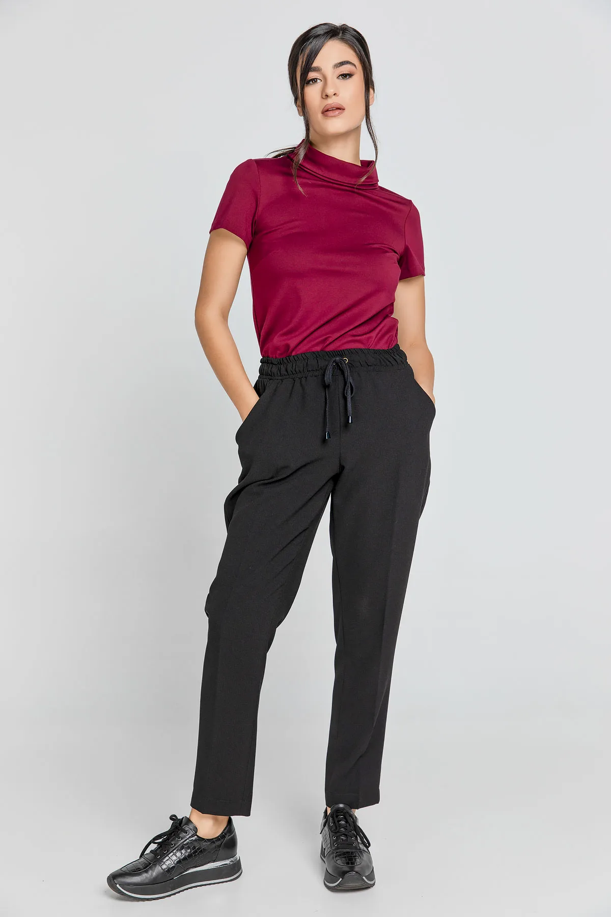 Zwarte taps toelopende broek van crêpe stof. Elastische tailleband en bandjes die vooraan vastzitten. Twee zakken vooraan. Ons model is 176cm en draagt maat 36/S. Afmetingen voor maat 36/S (in cm): Taille-30, Onderkant-47, Lichaamslengte(binnen/buitenkant)-71/91. Accessoires zijn niet inbegrepen. 92% polyester-8% elastan