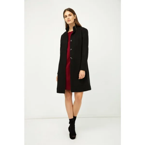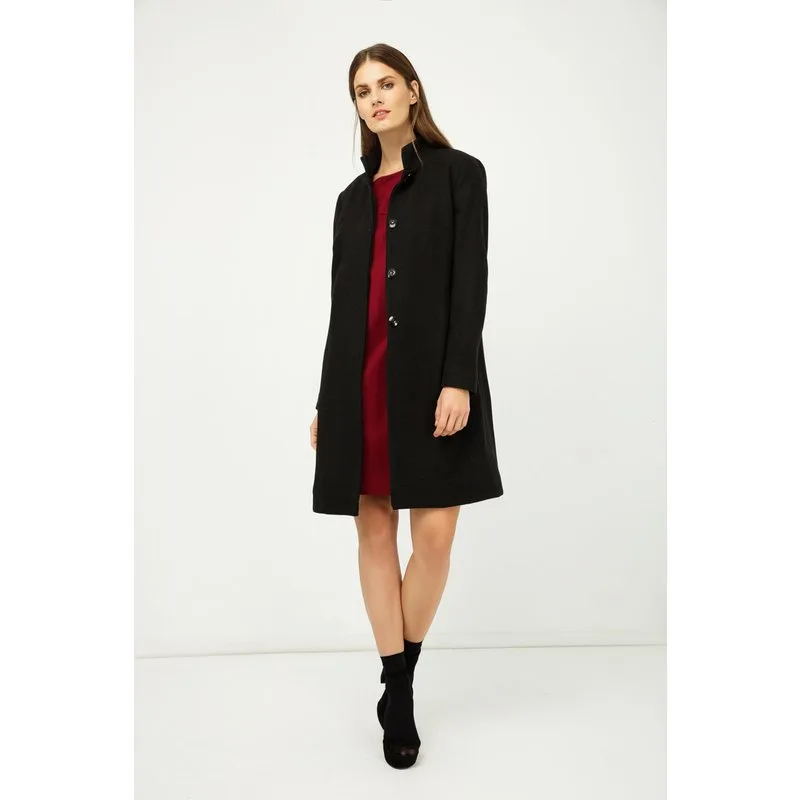Langdurige zwarte jas van geweven jassenstof. Rechte kraag van 6 cm. Sluit aan de voorkant met een grote vierkante zwarte knop onder de kraag en verborgen ronde zwarte knopen. Pasvorm met figuurnaden op de borst voor een perfecte fit. Zakken aan de zijkant. Licht A-lijn silhouet. Volledig gevoerd. Lengte voor maat 38: 98 cm.