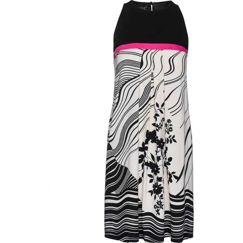 Deze mouwloze jurk heeft een ronde halslijn. Het bovenste deel is van zwarte, dubbele gabardine stretchstof en het onderste deel is van bedrukte jersey stof, viscose-elastaan. Met een fuchsia, horizontale strook ertussen. De jurk sluit aan de achterkant met een decoratieve knoop. Er zijn drie plooien aan de voorkant en de jurk loopt onder de buste uit in een A-lijnsilhouet.