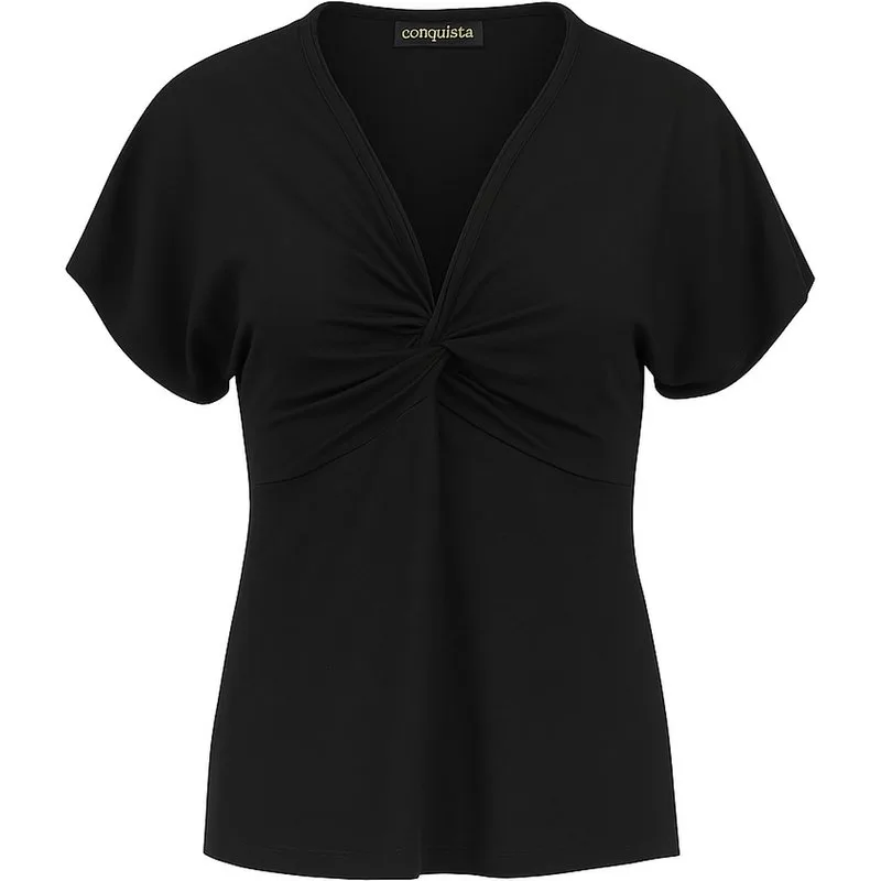 Geef je dagelijkse stijl een boost met deze elegante zwarte jersey top van Conquista. Deze top is gemaakt van een zachte en ademende mix van 92% viscose en 8% elastaan en biedt een flatterende pasvorm met lichte stretch. Het gedraaide detail aan de voorkant bij de buste zorgt voor een verfijnd silhouet, terwijl de fladdermouwen en de V-halslijn een vleugje vrouwelijke charme toevoegen. Dit veelzijdige kledingstuk is perfect om te combineren met zowel casual als geklede looks en is onmisbaar in je garderobe. Met zorg gemaakt voor comfort en stijl die lang meegaat.