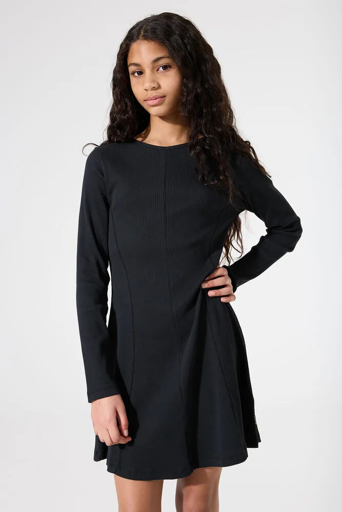 Ribstof jurk met opvallende naden. Deze jurk heeft een ronde hals, lange mouwen en een regular fit. Dit item is gemaakt van 100% katoen. Better Cotton is een initiatief dat zich wereldwijd inzet voor betere omstandigheden in de katoenindustrie.