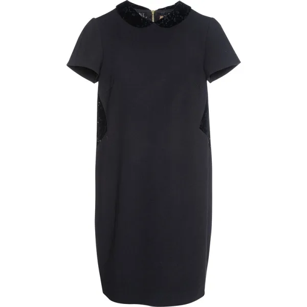 Zwarte jurk met korte mouwen van geweven stretchstof. Ronde kraag in fluwelen kant. Fluwelen kant achteraan bovenaan en vooraan aan de zijkanten. Darts bij de buste voor de perfecte pasvorm. Sluit aan de achterkant met een goudkleurige metalen ritssluiting van 50 cm. Los silhouet in zakstijl. Volledig gevoerd. Lengte jurk voor maat 38: 94cm. Ons model is 178cm en draagt maat 36.