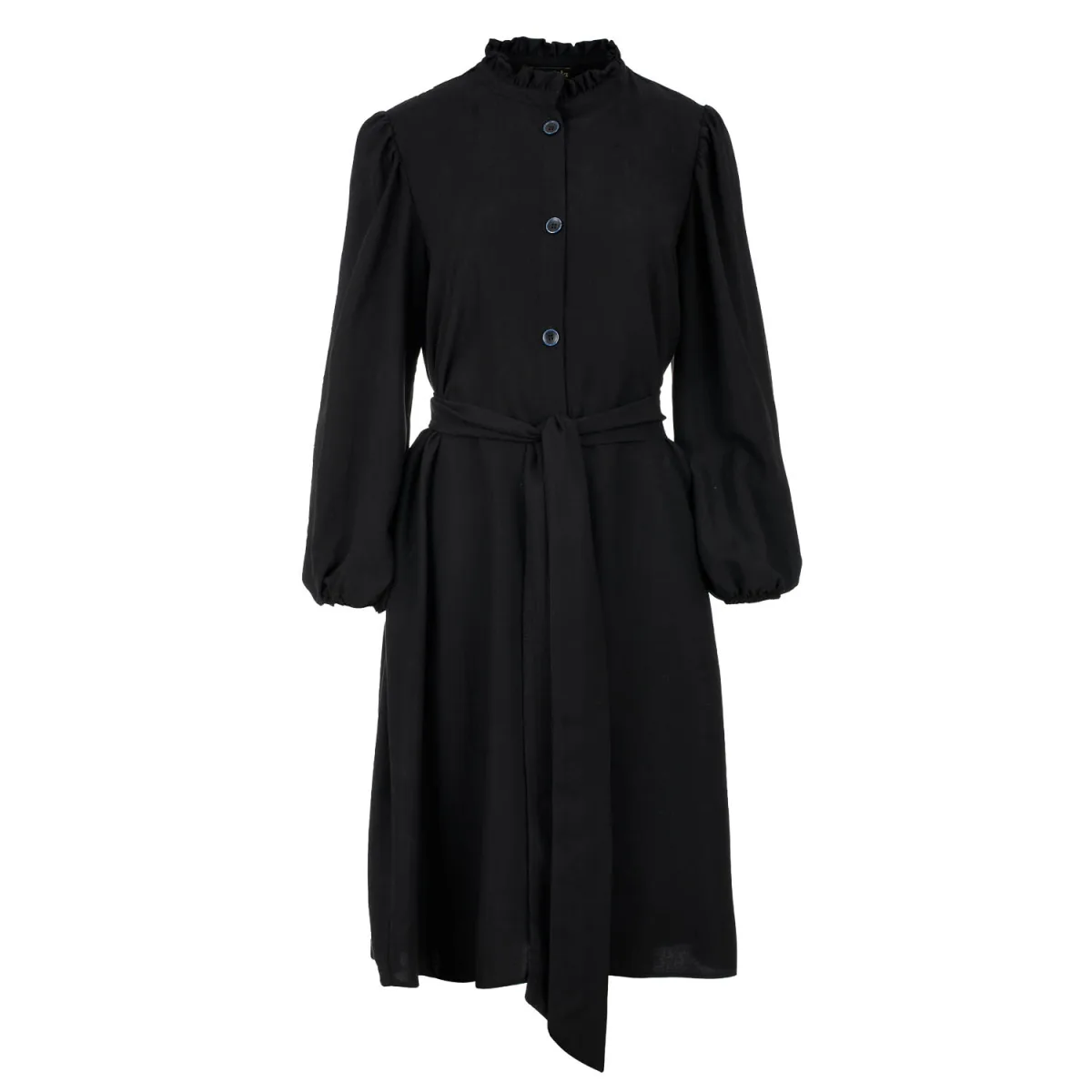 Deze zwarte jurk met lange mouwen is gemaakt van geweven tencel. Er zitten plooitjes op de schouders en elastiek aan de manchetten waardoor plooitjes ontstaan. Het heeft een ronde, gesloten halslijn met een opstaande kraag met ruches. De jurk heeft een sluiting aan de voorkant met decoratieve knopen. De jurk kan met of zonder ceintuur gedragen worden. De ceintuur is inbegrepen.