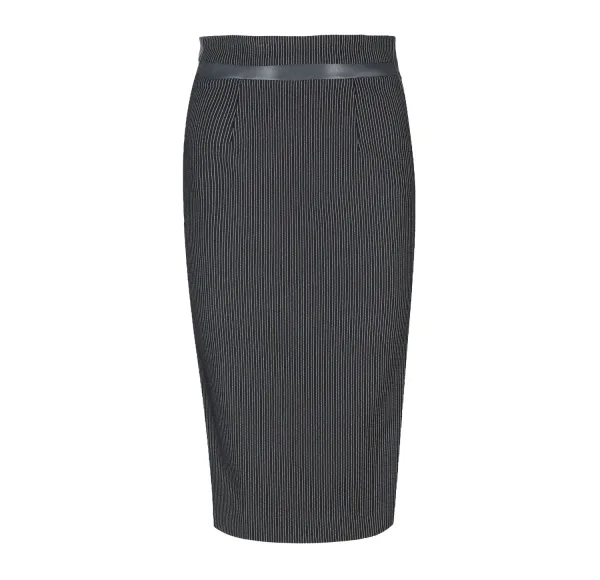 Deze zwarte kokerrok met hoge taille is gemaakt van gestreepte Punto di Roma-stof. De taille heeft een band van imitatieleer. Met een verborgen rits en een kleine split aan de achterkant. De jas heeft een voering van stretchpolyester. De rok heeft een midi-lengte en een aansluitend silhouet.