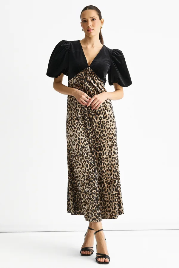Zwarte midi-jurk met contrasterende top van fluweel met dierenprint Prijzen