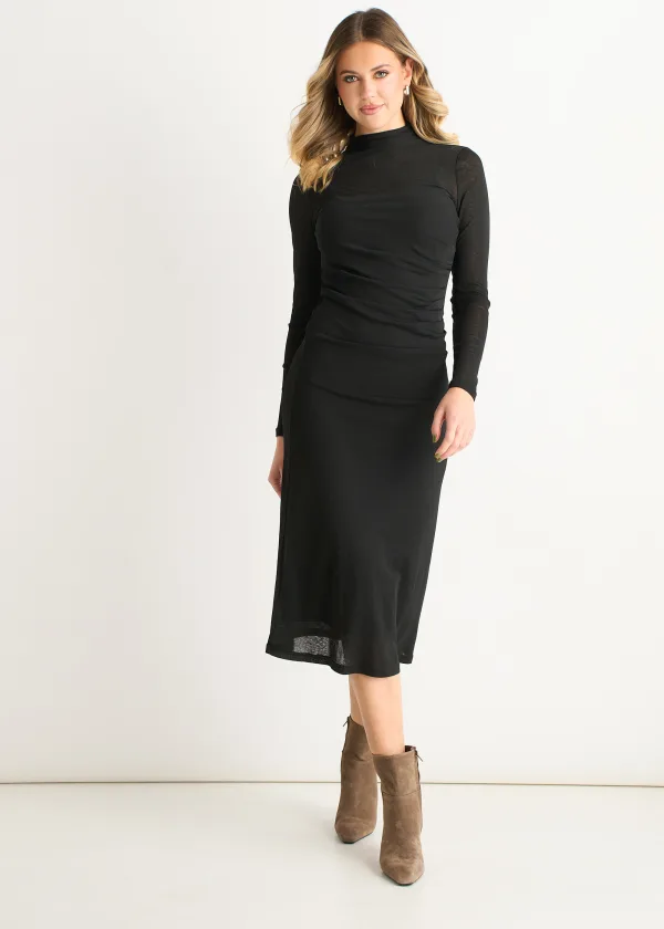 Deze zwarte midi-jurk is moeiteloos chic en onmiskenbaar flatterend. De gerimpelde jersey stof valt mooi en accentueert op de juiste plaatsen. De lange mouwen zorgen voor bedekking en elegantie, terwijl de midi-lengte veelzijdige styling biedt voor zowel overdag als 's avonds. De gerimpelde details zorgen voor beweging en visuele interesse, waardoor een dynamisch silhouet ontstaat dat prachtig staat bij elk figuur.