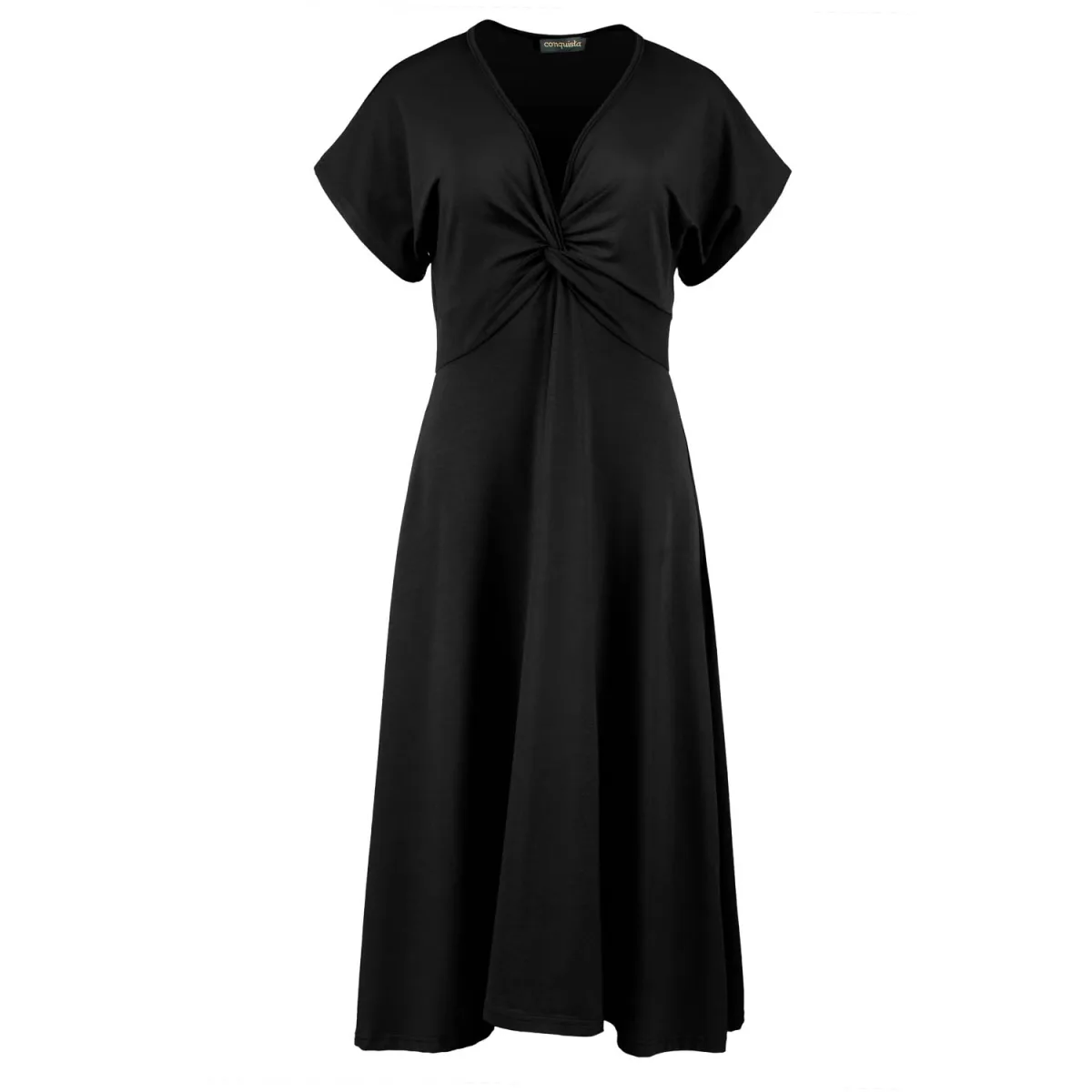 Deze zomerjurk is gemaakt van stretch jersey. Het heeft korte mouwen en een V-hals met knoopdetail bij de buste. Daaronder eindigt diagonaal in de zijnaden een paneel van 5 cm. De rok heeft een cloche silhouet. Het kledingstuk is gestyled met een relaxte pasvorm en midi-lengte.