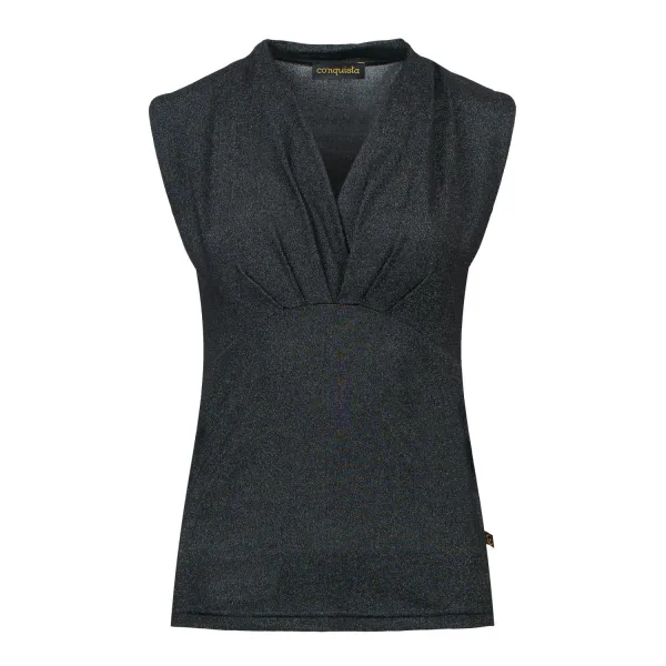 Deze zwarte top is gemaakt van stretchstof: viscose-elastaan. Hij is mouwloos en heeft een voorkant in wikkelstijl voor een diepe V-hals. Met een naad onder de buste.